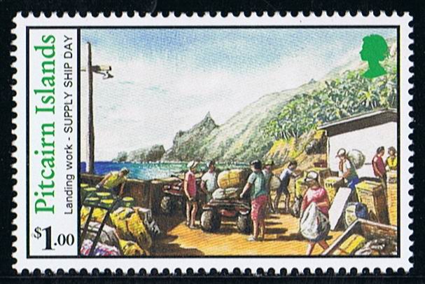 On supply ship day and on the day after, the Co-operative store is a place of intense activity as the $1.50 stamp in this issue shows. The Co-operative store was established in 1967 through locally contributed share capital. An elected committee operates the store and places orders for items through the Pitcairn Island Administration Office in New Zealand. The store was modified in 1989 and now has the appearance of a mini supermarket with self service checkouts at the door.