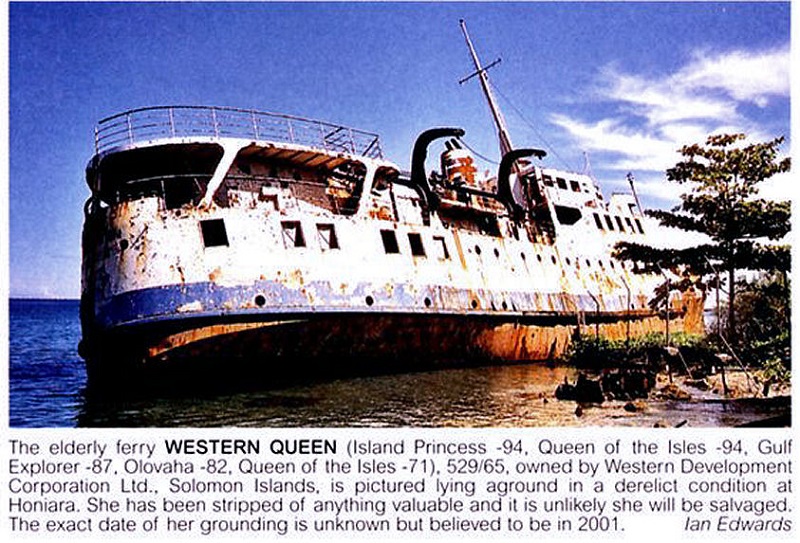 Western Queen beached in Honiara, Guadalcanal, Solomon Islands Sep-Oct 1998. According to locals she was left unmanned at anchor during a cyclone and dragged her anchor grounding herself near Honiara. Apparently attempts to free her failed and she was left as is. At the time I walked through her she had been completely stripped of everything right down to light switches and wiring. Exterior wise though despite her grounding she still looked in better cond. than most of the vessels still in service there. Less rusty, anyhow! Check out this excellent site about her life by a former crew member: http://www.queenoftheisles.com