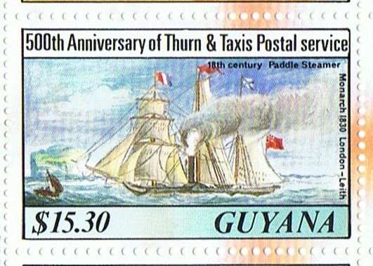 The stamp of Guyana I am sure is designed after the painting painted by Thomas G. Dutton and shows us the paddle steamer MONARCH when she is passing on 21 July 1834 Bass Rock off the coast of Scotland on passage from London to Edinburg under command of Capt. Baine.