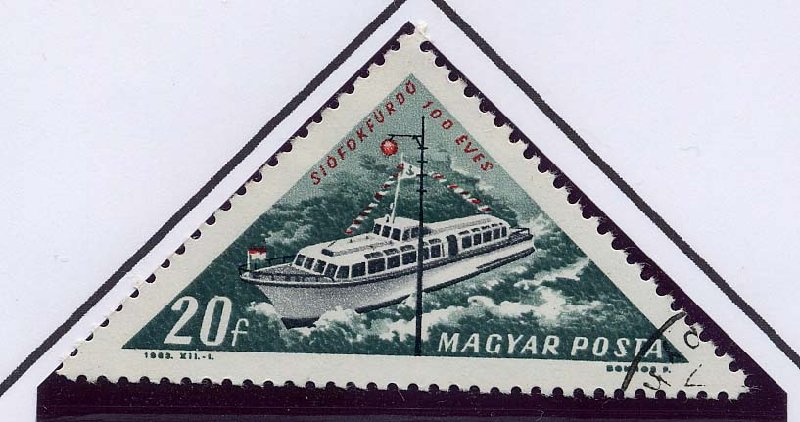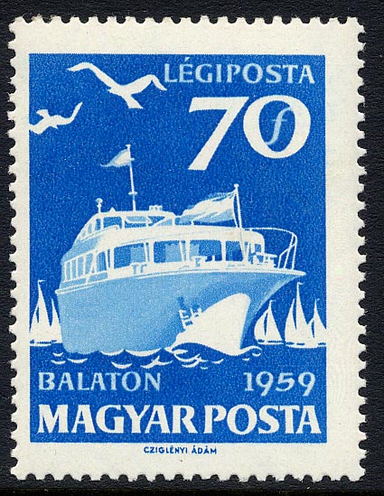 One of the well-known Continental water buses is featured on the 70 Ft. stamp. This is of aluminium construction and is of the '301' type. She is the twin-screw Tihany, built by Dunai Hajogyar, of Vac, with a riveted hull and a composite superstructure. Maximum length is 26.55 metres, beam 5.32 m., depth of hold 2.04m, and maximum draft 1.06 m. This square-tuck-built ship is single-decked, the hull