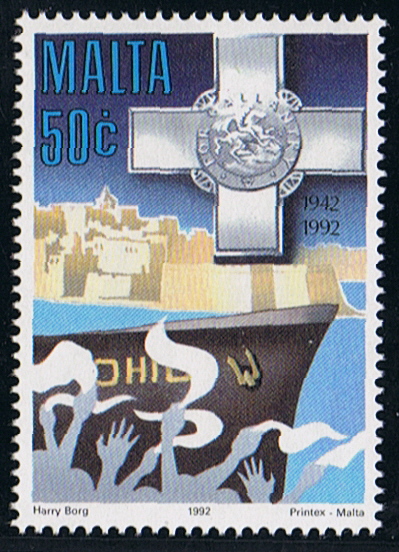 Well done it was, though the great ship was now no more than a useless hulk, 11.000 tons of oil had been brought safely through - oil which was to enable Malta to defend herself and play her vital part in the great events which were now fast developing. When Captain Mason received his George Cross personally from King George VI it was not only a reward for the Master of the OHIO recognizing his own personal indomitable courage but also that of every member of his crew. Together they had set a standard of valour which ranks high in the storey of naval warfare. Chief Engineer Wyld, whose dogged perseverance, skill and courage had managed to keep the engines turning long after they might have been justly abandoned, received the high decoration of the DSO, one of the first to be awarded to an officer of the Merchant Marine. In addition, five DSC's and seven DSM's were given to other officers and men of the OHIO's crew who had earned special citations.