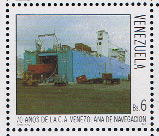 Mr. Pieter Crichton gives that the vessel depict on this stamp is the VENTUARI, by comparing the vessel on the stamp with a photo given on http://www.faktaomfartyg.com/ventuari_1978.htm I agree, there was one sister the AFRICAN SOUL but she never was owned by a Venezuelan company, or used in a service to Venezuela. The stamp gives a white funnel; I am not sure to which company this funnel belongs. The photo depicts in Watercraft Philately gives a black funnel with a broad white band and a logo. So far I know does Stena also use the blue painted hull for their ro-ro vessels.