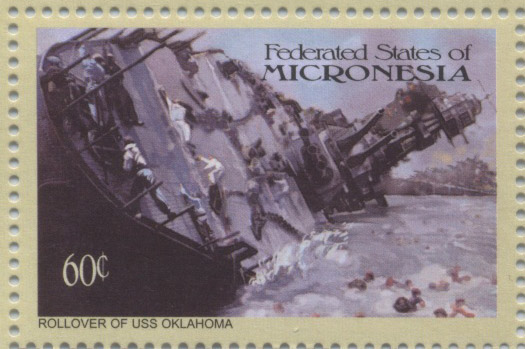 She was based at Pearl Harbor from 6 December 1940 for patrols and exercises, and was moored in Battleship Row 7 December 1941, when the Japanese attacked. Outboard alongside MARYLAND OKLAHOMA took 3 torpedo hits almost immediately after the first Japanese bombs fell. As she began to capsize, 2 more torpedoes struck home, and her men were strafed as they abandoned ship. Within 20 minutes after the attack began, she had swung over until halted by her masts touching bottom, her starboard side above water, and a part of her keel clear. Many of her crew, however, remained in the fight, clambering aboard MARYLAND to help serve her antiaircraft batteries. Twenty officers and 395 enlisted men were either killed or missing, 32 others wounded, and many were trapped within the capsized hull, to be saved by heroic rescue efforts. Such an effort was that of Julio DeCastro, a civilian yard worker who organized the team which saved 32 OKLAHOMA sailors.