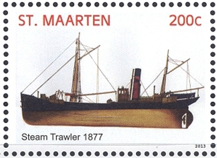 The stamp gives the year 1877 but not a shipsname, the stamp is designed after a drawing in the book “Ship 5,000 Years of Maritime Adventure” by Brian Lavery, which shows a steam trawler exact the same as on the stamp, only the funnel colour is red on the stamp while it is yellow in the book, but the book drawing also gives not a name.